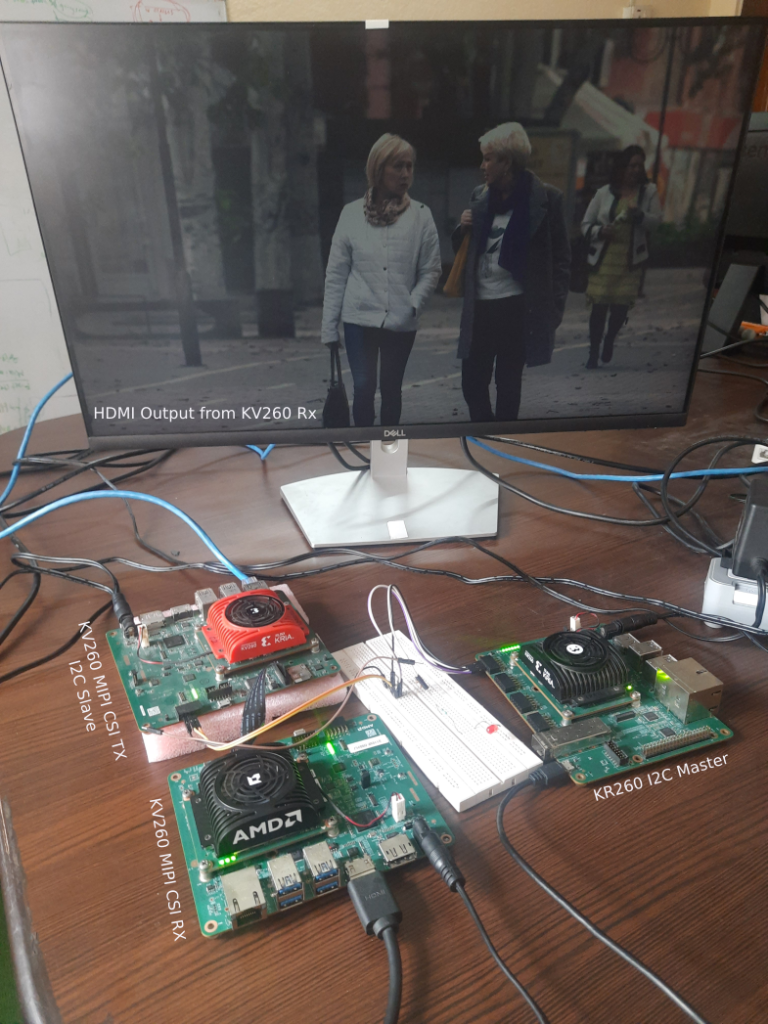 Below is the test setup of MIPI CSI2 Tx linux system running on one Kria KV260 and MIPI CSI2 Rx on another Kria KV260.